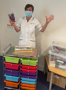 Today, we donated a craft trolley to store and deliver items to patients for individual and group craft activities (see picture with Suzanne’s fellow OTA Cathy Barnes loading up the new trolley).The craft supplies include: